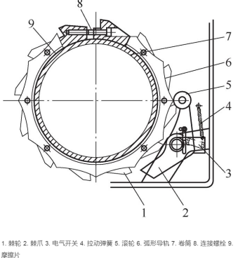 棘輪棘爪機(jī)構(gòu)用作電動(dòng)葫蘆安全制動(dòng)器,其制動(dòng)特性具有以下特點(diǎn):1)嚙合動(dòng)作依靠卷筒下降過(guò)程中轉(zhuǎn)速超速觸發(fā);2)棘輪棘爪嚙合動(dòng)作后發(fā)揮制動(dòng)效用,依靠卷筒與摩擦片的摩擦產(chǎn)生熱能,化解掉系統(tǒng)的機(jī)械能。